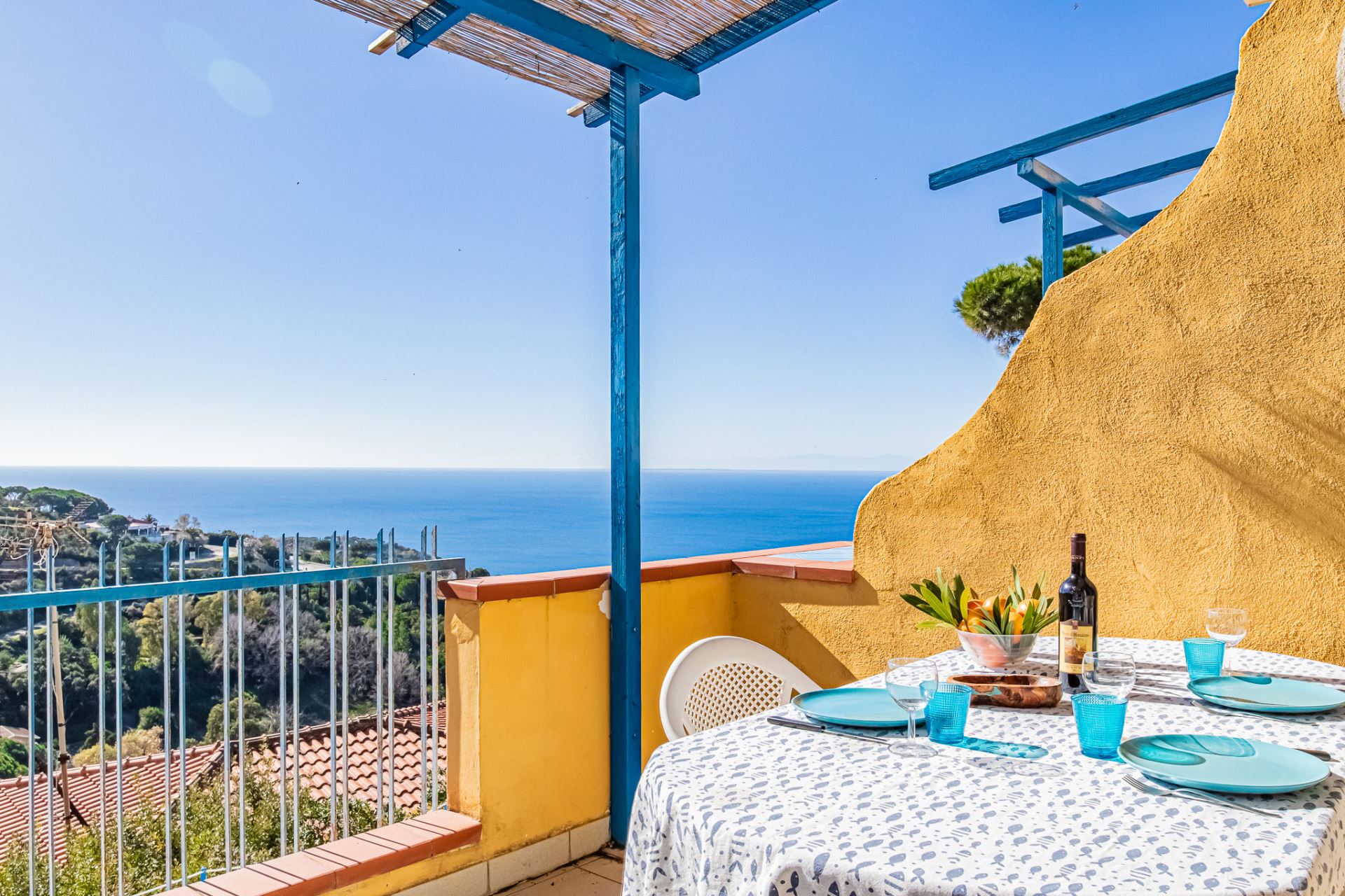 La casa è dotata di una terrazza soleggiata con bellissima vista mare, attrezzata con il necessario per poter mangiare all'esterno.